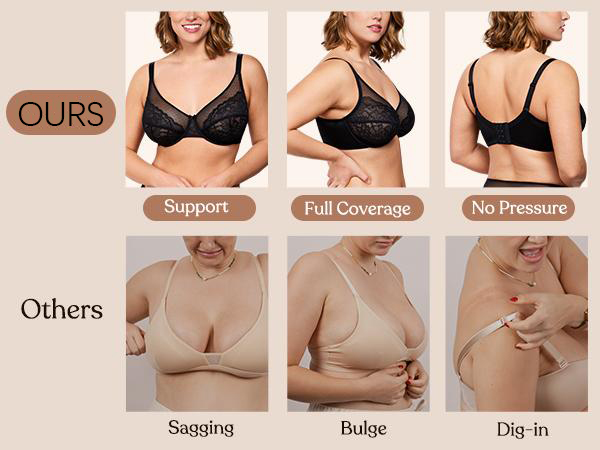 Smoothing for Back Fat: U-Shaped back flatters your back and its side wings mesh band, with 4-way stretch fabric on the unpadded bra, subtly smooths your back and has sewn-on elastic at the top and bottom, you never have to sacrifice comfort for a pretty look again.
