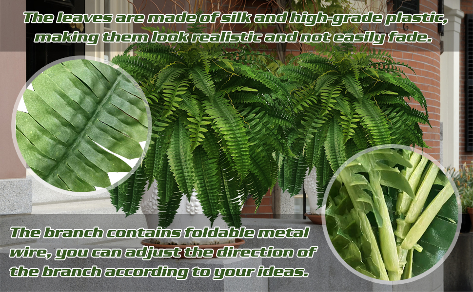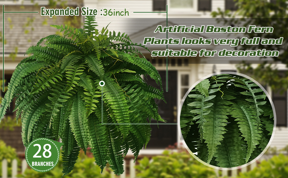 Suitable for decoration: This large Artificial plants Boston Fern contains 28 branches, making it looks very plump. The length of a single branch can reach 22 inches, and the horizontal expansion size can reach 36 inches, making it looks very large and full. It is very suitable for places such as courtyards, living rooms, offices, etc